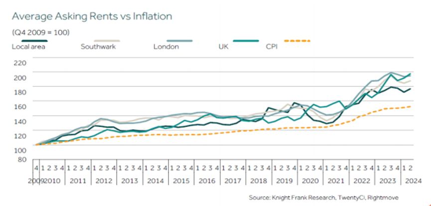 得天独厚的文化区位,叠加强劲的区域发展潜力,也为项目资产保值增值提供了稳定保障。根据国际知名的房地产顾问公司莱坊(Knight Frank)2024年数据显示,伦敦南岸已完成240万平方英尺优质办公空间建设,自2014年以来,其步行范围内新增了大量餐饮、娱乐空间,办公室租金年均增长5.7%,是同期通胀率的两倍有余,商业氛围的升级持续带动区域资产价值稳步提升。具体到项目周边,距离琢岸阁0.75英里范围内租赁报价增长达20.9%,未来五年伦敦核心区租赁市场预计将实现20.5%的累计增长。