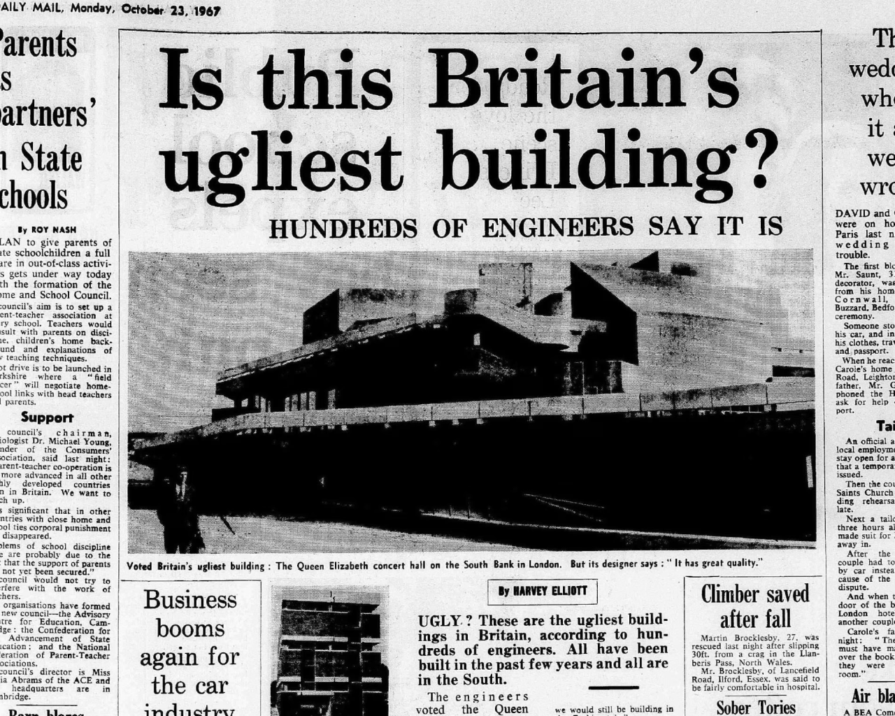 1967年竣工时,工程师们在一项新建筑民意调查中将伊丽莎白女王音乐厅评为“最丑建筑”。《每日邮报》甚至在当年发布了题为“这是英国最丑的建筑吗?”的文章,配上了伦敦南岸中心的照片,使得它一度成为了公众眼中的“混凝土怪物”。