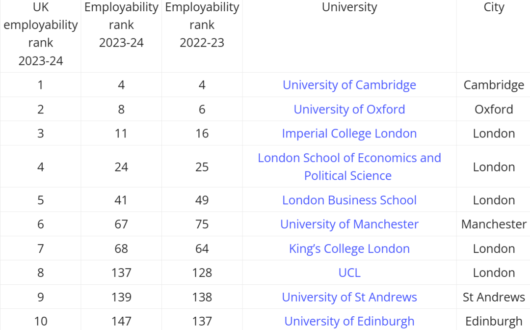 不仅在学术上实力强劲,伦敦高校的就业数据也非常出色。根据英国国家统计局2023年的数据,英国毕业生的总体就业率为87.4%,其中硕士毕业生的就业率更高,达到90.8%。在《The Student》2024年全球大学就业能力排名中,伦敦就有五所院校位居英国前十。高就业率的背后还伴随着高薪酬,伦敦大学学院全日制研究生课程的毕业生起薪中位数为42,000英镑,而授课型课程的毕业生起薪中位数为32,000英镑。