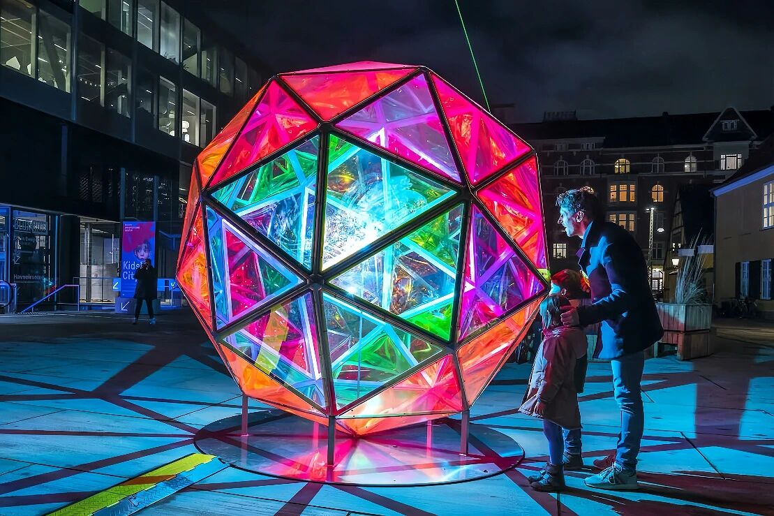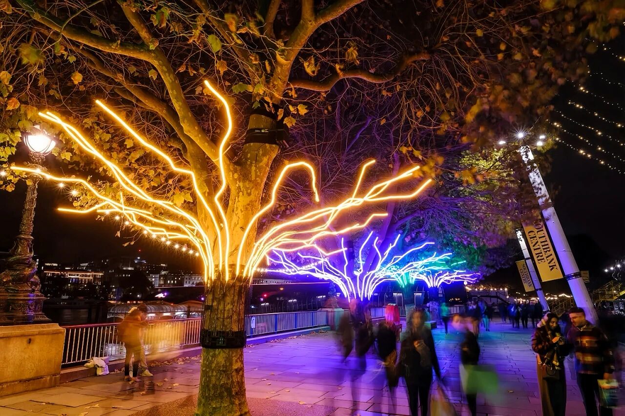 沿着河岸漫步,夜色被另一种质感笼罩,Winter Light艺术展的灯光装置散落于河畔,呈现出极具观赏性的冬季光影景观。今年的作品阵容依旧亮眼,包括艺术家Jakob Kvist创作的Dichroic Sphere——多年来都是伦敦南岸最热门的拍照点之一,以及Nathaniel Rackowe的作品Desire Lines,将树冠点缀成闪烁的光带。不同的装置在步行路线上自然展开,虚幻的色彩与层叠光影在黑夜中交织,成为一条值得细细品味的艺术长廊。